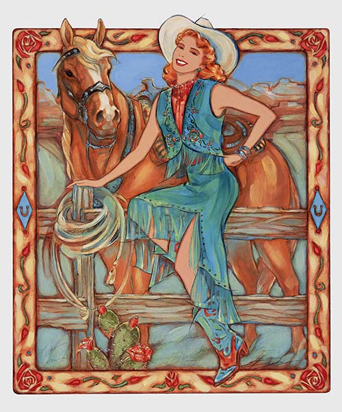 Commissioned for Patricia Wolf, with the model wearing one of her amazing, original designs. A fun retro piece re-inventing the 1940’s-50’s style pin-up gal. 14″ x 17″ fine art print of original acrylic painting. Fade resistant inks on high quality acid-free archival paper.