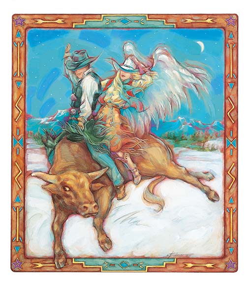 Originally used for a calendar on angels. Workin’ Overtime depicts a Bull-riding cowboy at his most vulnerable, but he is shielded from harm in the loving embrace of his guardian cowgirl angel riding companion. 14″ x 16″ fine art print of original acrylic painting. Fade resistant inks on high quality acid-free archival paper.