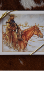 This was originally painted for the December page of a western calendar. Goin' Home is a portrait of my husband and his favorite working dog. It is about life on our cattle ranch and the quiet satisfaction after a long day; a portrait in essence of the lifestyle we have chosen. The painting is based in watercolor with acrylic glazes. 18" x 20" fine art print of original watercolor/acrylic painting. Fade resistant inks on high quality acid-free archival paper.