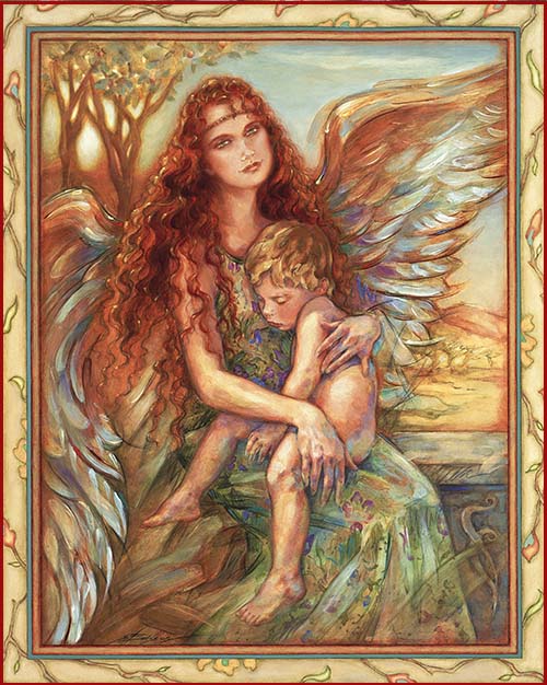 Portrays the guardian angel, the guardian of innocence. Someone to watch over us, to tenderly shield us from danger. Enfolded in her loving arms, we find comfort from pain, calm in a storm. My model here is the same gal I used in my painting “Down Time” in the Cowgirl Gallery. She really had gorgeous long red hair like this. She is seen here posing with her son. (Without wings, of course, I added those later). 14″ x 17″ fine art print of original acrylic/watercolor painting. Fade resistant inks on high quality acid-free archival paper.